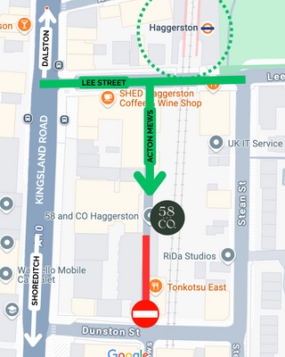 Please see the map with instructions. We sincerely apologise for any inconvenience caused and have an open case with Hackney Council and TFL. If you are having any issues finding us, please call 020 3095 9734.